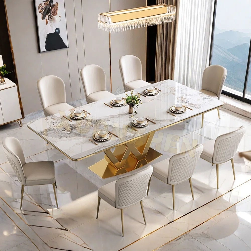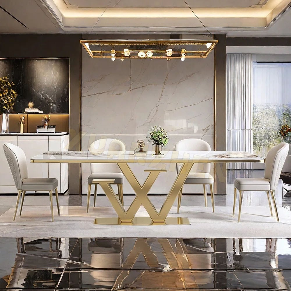 Firstly, the dining table features a stainless steel frame with rich golden PVD coating.